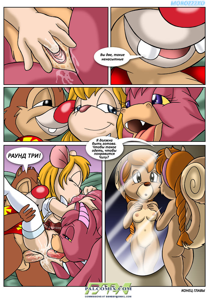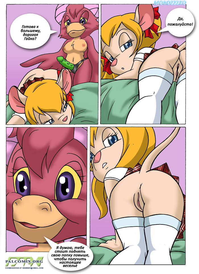Симпатичная Гаечка в белом топике, таких же чулках и красной юбке чувствует себя немного неловко в ожидании групповухи с Дейлом и каким-то розовым сисястым монстриком с большим зеленым страпоном. Но первые ласки, который нежный самка-монстр дарит Гайке, развеивают прочь все ее сомнения, а ласкание титек и влагалища длинным чувственным язычком еще больше возбуждают молодую мышь. Тут же отсосать свой хрен Гайке предлагает и Дейл, а дальше все идет по накатанной!