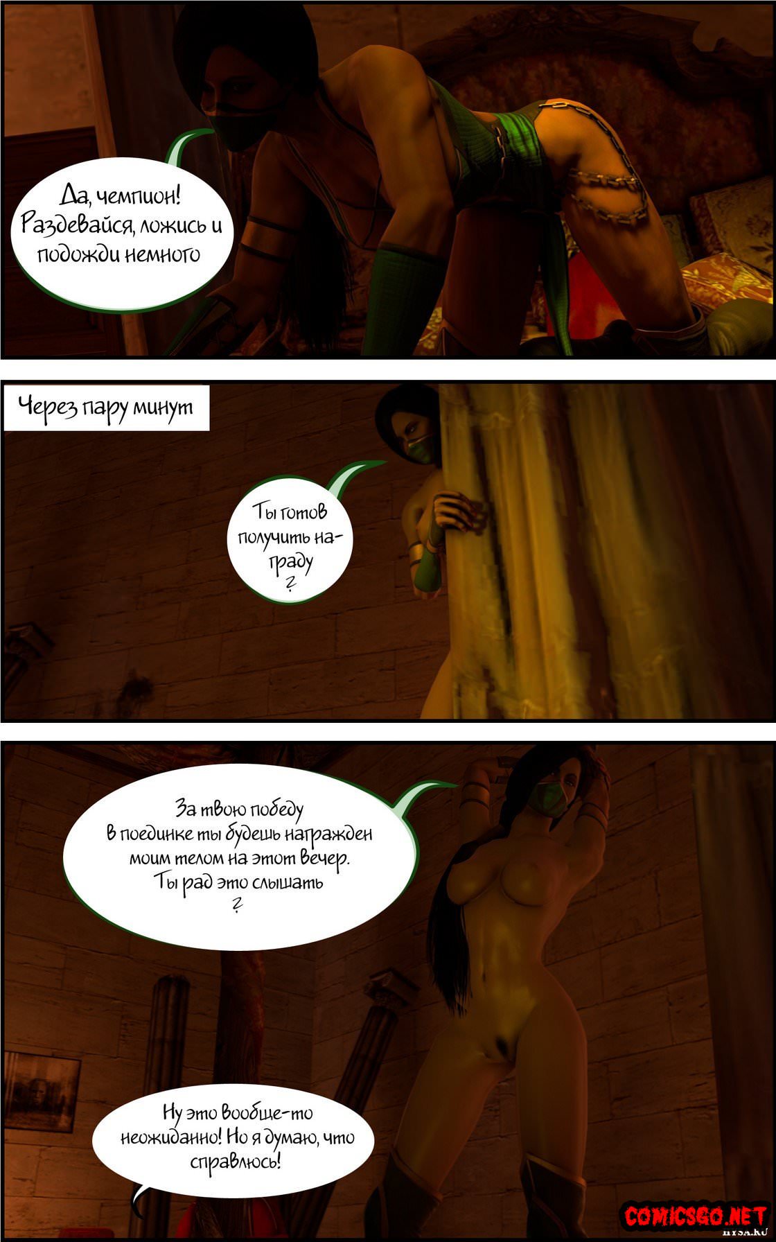 Участники Смертельной битвы получают достойную награду за свои победы. В этот раз, чемпион турнира удостоился компании сексуальной и воинственной смуглянки Джейд. Девушка пришла в спальню к чемпиону и начала баловаться с его большим членом. Она трахалась с ним в самых различных позах, до тех пор, пока свежая сперма не залила ее привлекательное личико. После этого она ушла, в надежде, что ее чемпион добьется новых побед…