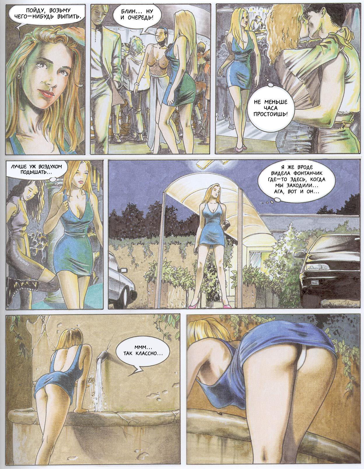 Главная героиня Селена в коротеньком синем платьице приезжает вместе со своим корешом в одну из суббот в местный ночной клуб, чтобы оторваться там, потанцевать и забыть обо всех проблемах. Трахалка хочет купить коктейля, чтобы утолить жажду, но очередь к бару слишком длинная, и Селена вспоминает, что где-то во дворе был фонтанчик, и там можно напиться. Сучка выходит во двор, наклоняется над фонтаном, а сзади  из припаркованной тачки в нее втыкают два чувака. Они включают фары, чтобы получше рассмотреть девицу, и тут начинается самое интересное!