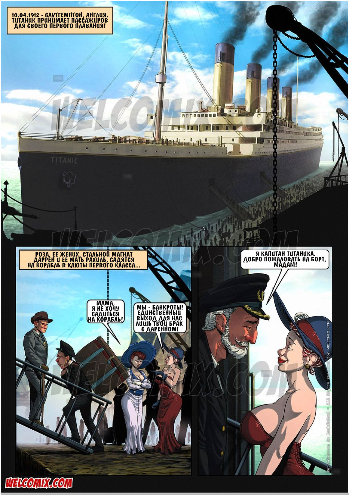 Сначала все идет по знакомому сценарию — на богатейшем роскошном корабле случайно знакомятся Роза, невеста богатого наследника, и Джеймс — обаятельный разнорабочий, чудом попавший на корабль. Искра, буря, страсть — и вот уже невеста вовсю развлекается с новым знакомым на автомобильной палубе. Может быть, эта история имела бы другой финал — но в это же самое время капитан корабля в одной из кают от души старается ублажить маму Розы. Пока капитана нет за штурвалом, к кораблю приближается айсберг…