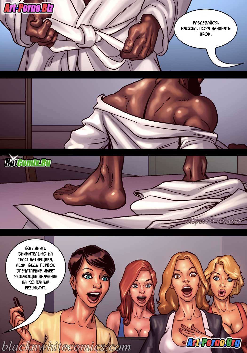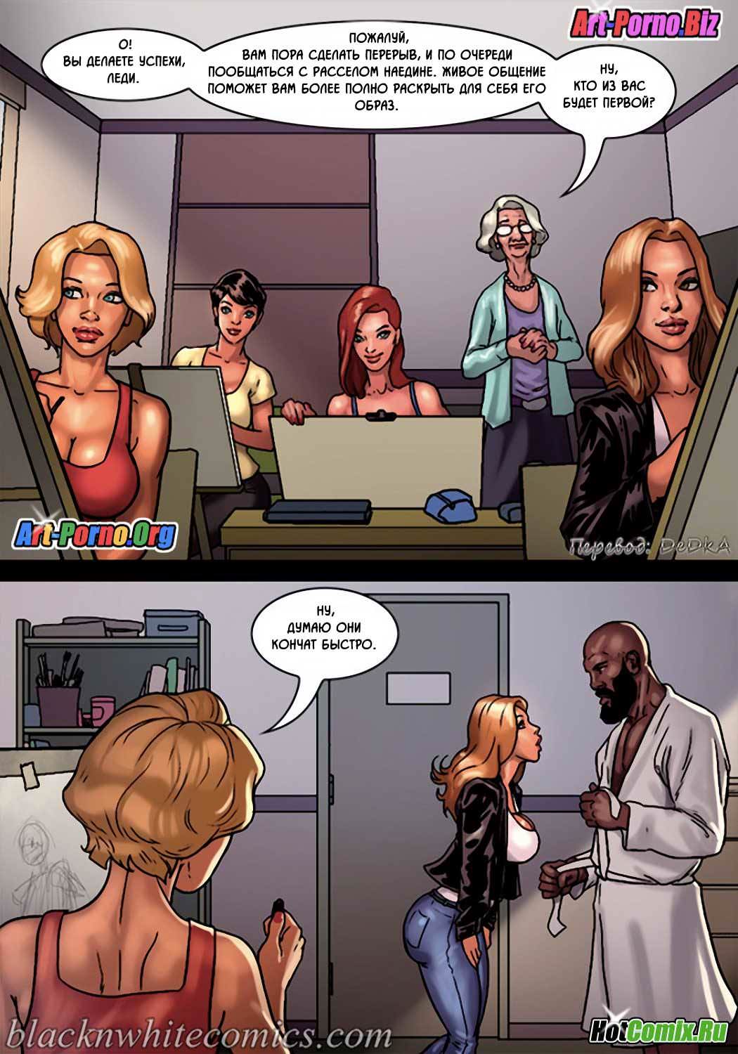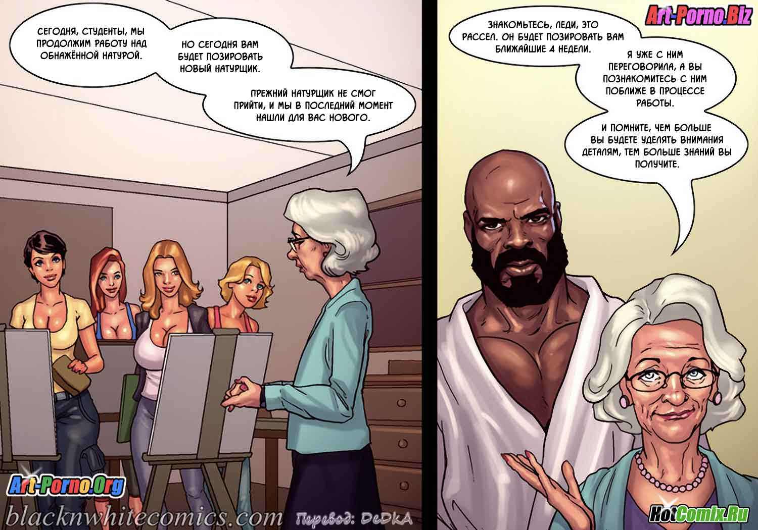 Четыре молоденькие фигуристые художницы никак не ожидали получить чернокожего качка Рассела, который только что вышел из тюряги, в качестве натурщика на ближайшие 4 недели. Девки открыто обсуждают его член до колен и то, будут ли они с ним спать или нет. Через какое-то время их престарелая бабулька-наставница приглашает каждую из девушек поближе познакомиться с Расселом в приватной комнатке, чтобы максимально глубоко проникнуться творческим настроением. И вот уже творчеством с Расселом занимается первая из шлюх…