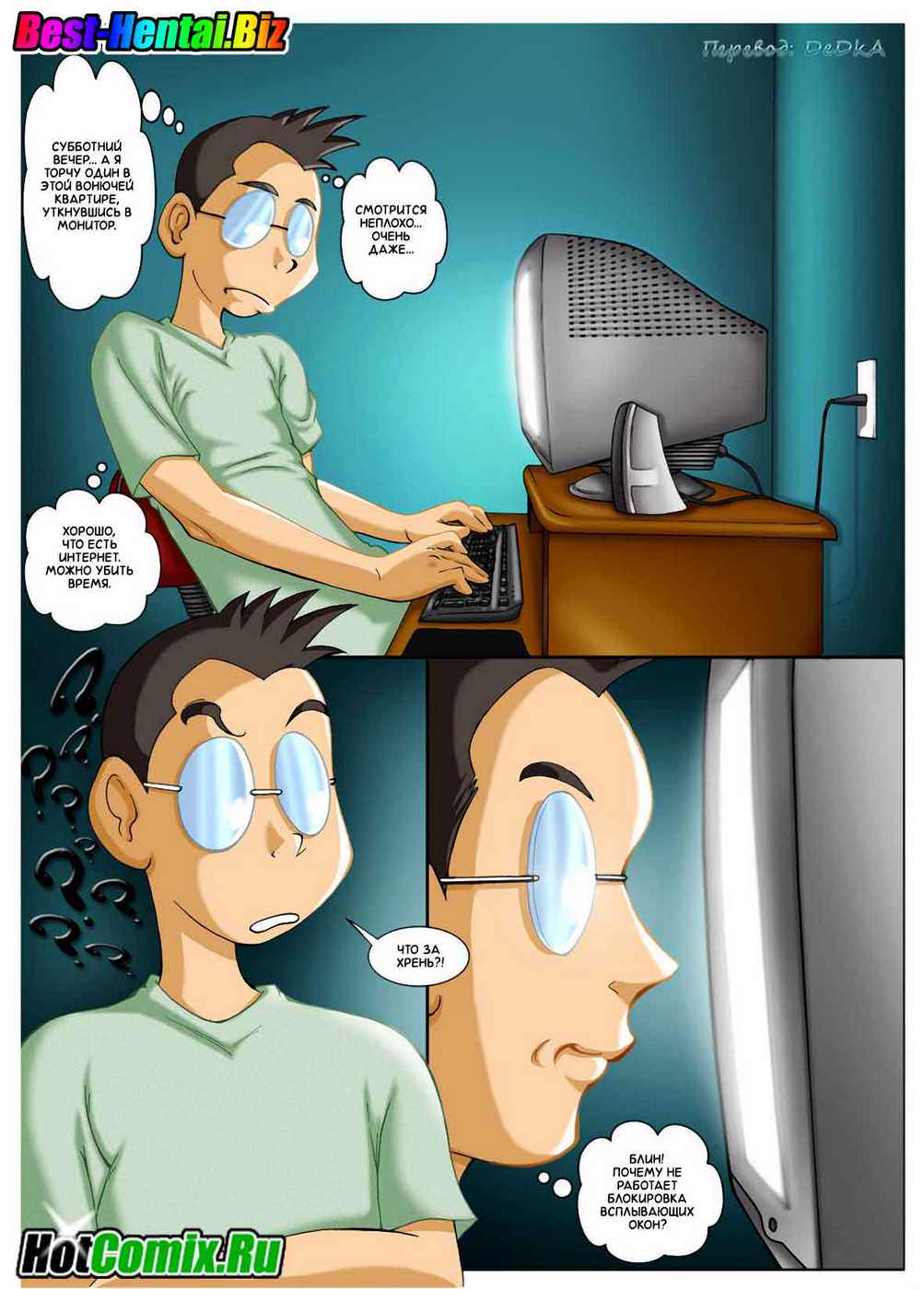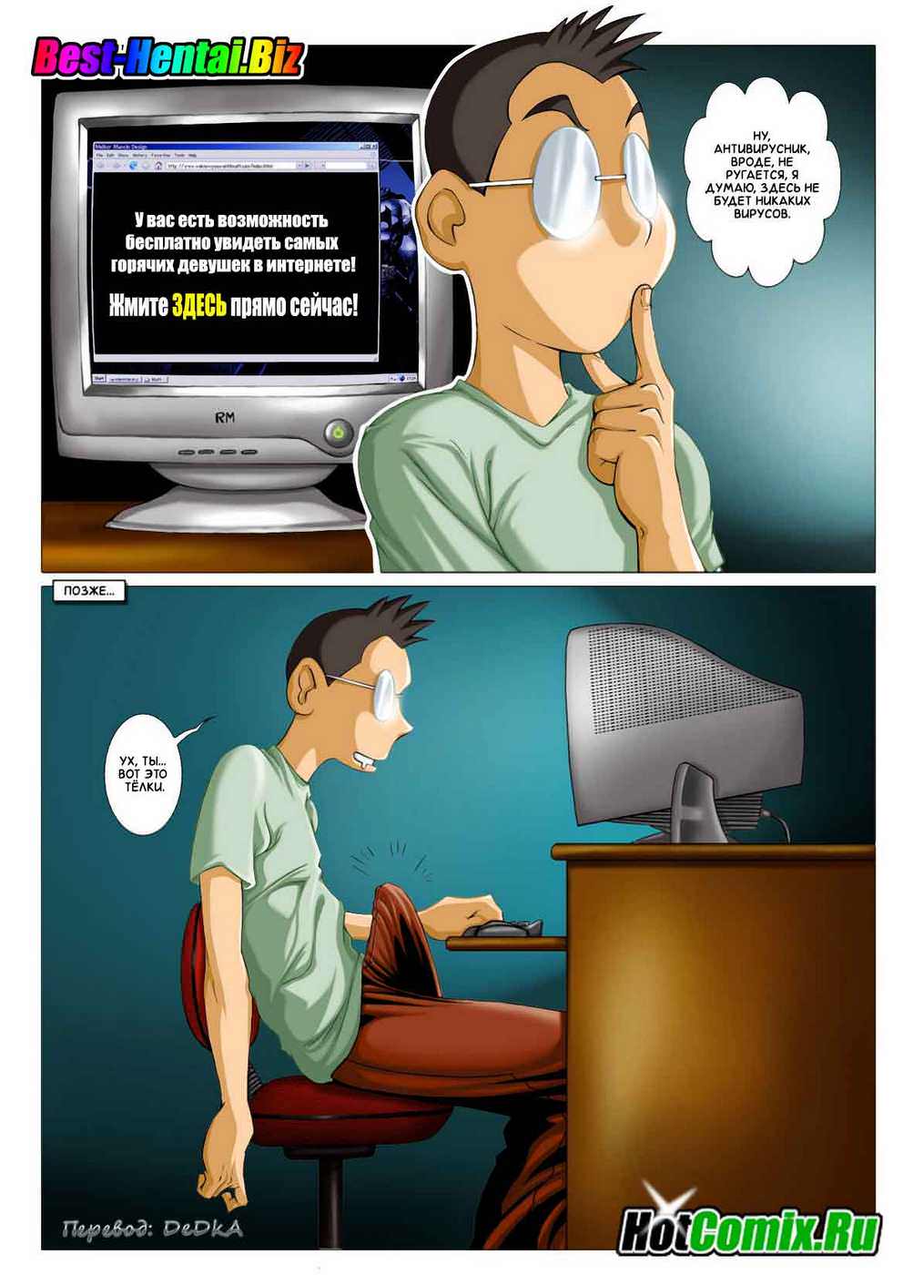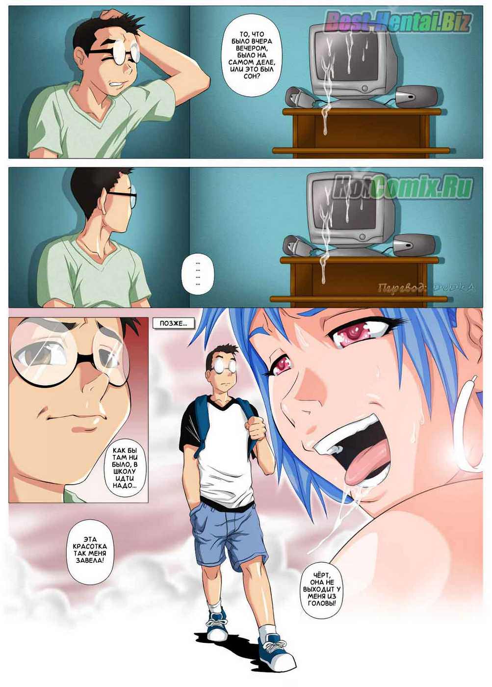 Мэт, как настоящий гик, проводит субботний вечер в одиночестве перед компьютером. Он давно не реагирует на спам-предложения от порно-сайтов — но сегодня почему-то решил откликнутся — и не пожалел об этом! Сайт не просто предлагал посмотреть на горячих красоток — это был настоящий виртуальный секс, со всеми тактильными ощущениями! На следующий день Мэтт мог думать только о своей партнерше с того потрясающего сайта, и, конечно, не смог сдержать эрекции прямо на занятиях в колледже. Однокурсница была в шоке, когда увидела Мэтта с огромным стояком. Редкий случай — виртуальный секс нашел продолжение в реальной жизни!
