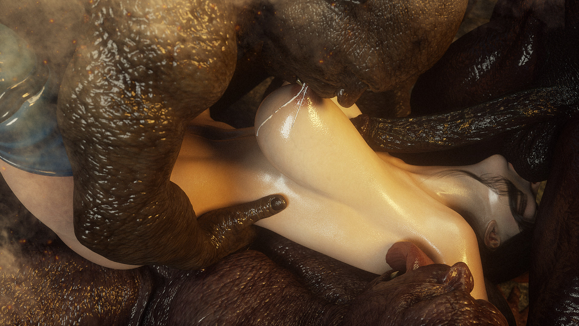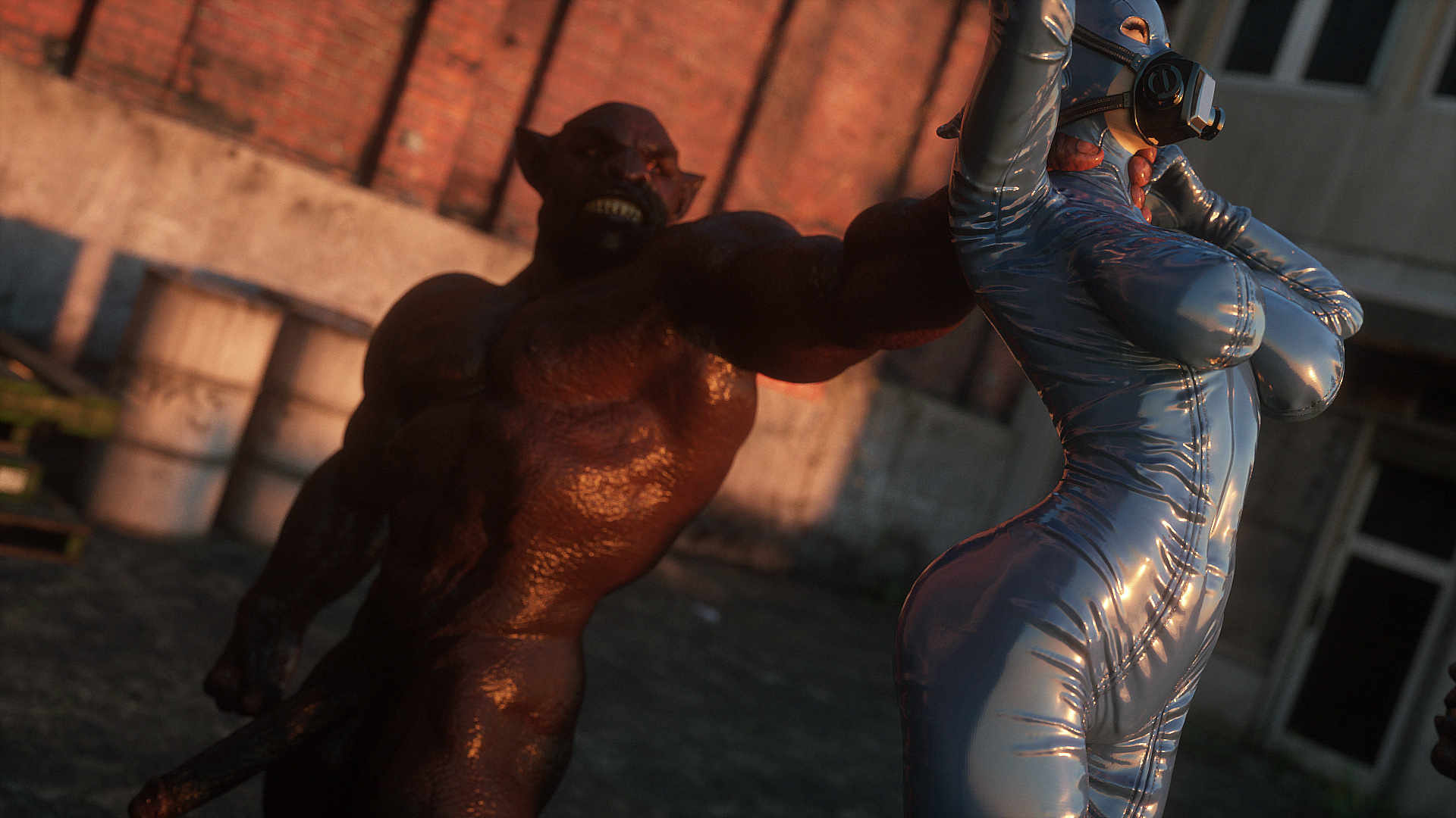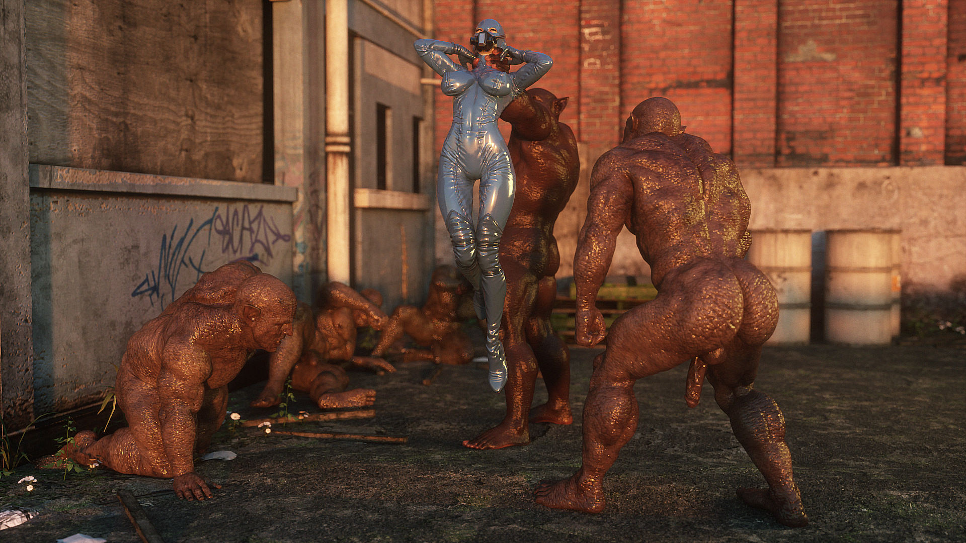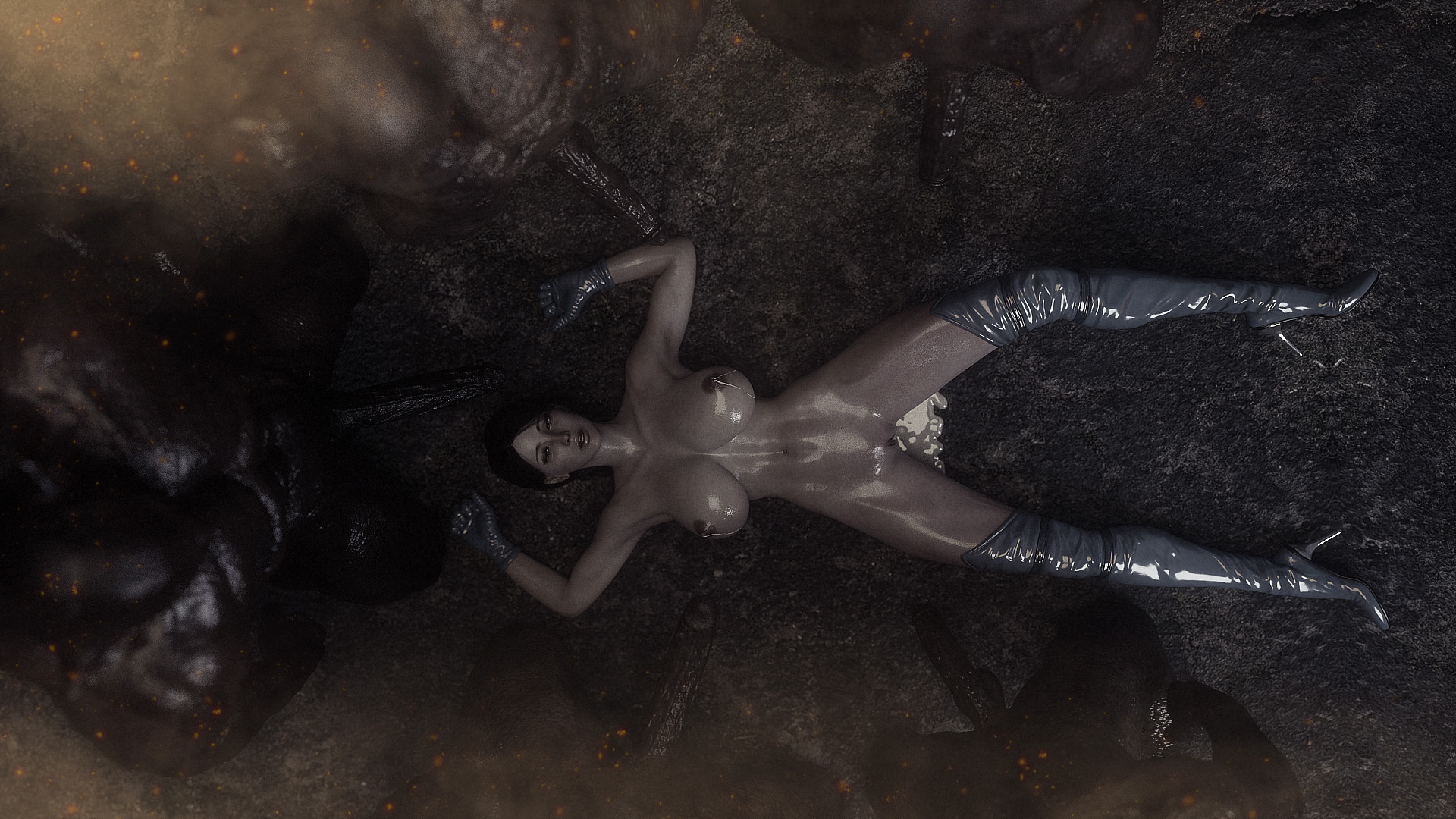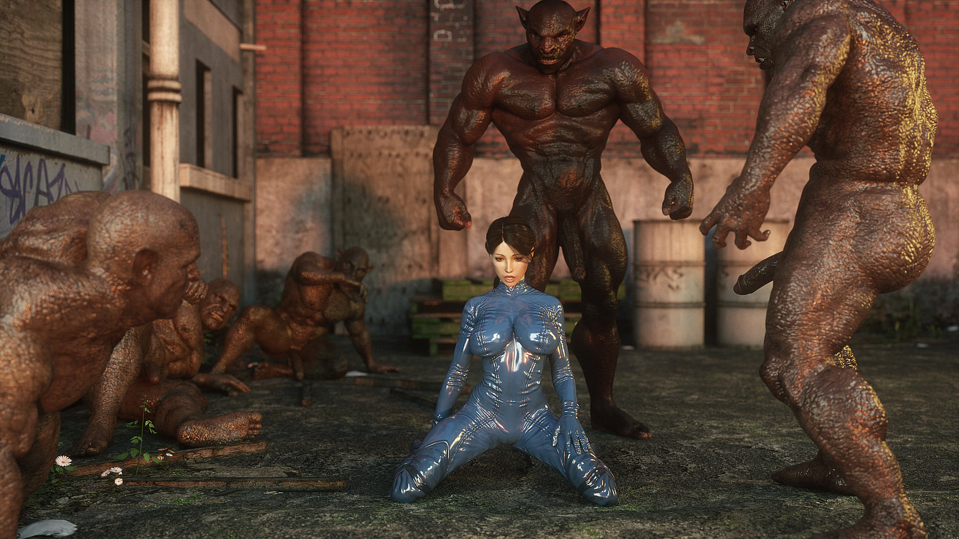 Наши герои попали в настоящую зону отчуждения- это место оккупировано гигантскими монстрами, жадными до плоти и крови. Нужны специальные костюмы из латекса, чтобы не заразиться опасным вирусом, но увы, даже костюм не защищает от всех опасностей. Напарник главной героини уже повержен, но девушка еще жива. Гигантские обнаженные монстры замечают ее и для начала снимают защитный костюм, а потом уже начинают проводить межрасовые секс-эксперименты.